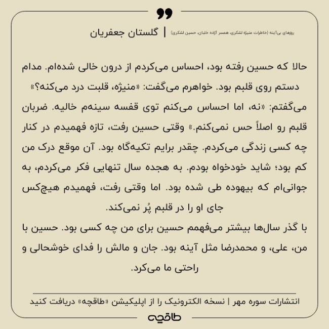 لبخندم جان می‌گیرد. چادرم را تا می‌کنم و خودم قبل از پرسش سوالش می‌گویم: «درباره عکس اون مرد می‌خوای بدونی!»